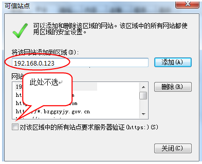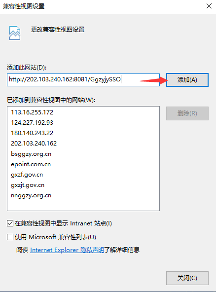 4、点击“站点”按钮,出现如下对话框,如下图,输入系统的IP地址,http://202.103.240.162:8081/EpointSSO,然后点击“添加”按钮完成添加,再按“关闭”按钮退出。