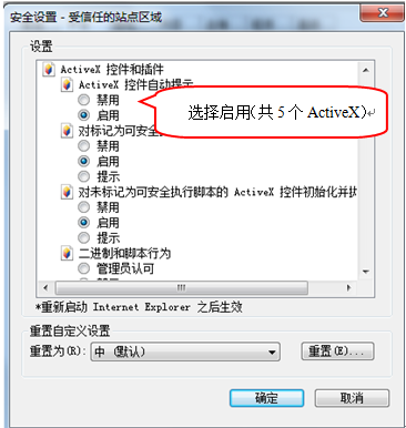 6、在弹出窗口中把Activex控件和插件的设置全部改为启用,如下图: