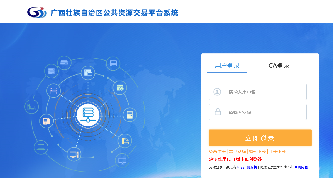 1、先打开广西壮族自治区公共资源交易中心门户网站(http://gxggzy.gxzf.gov.cn/),选择我要投标,点击链接打开系统登录页面,如下图: