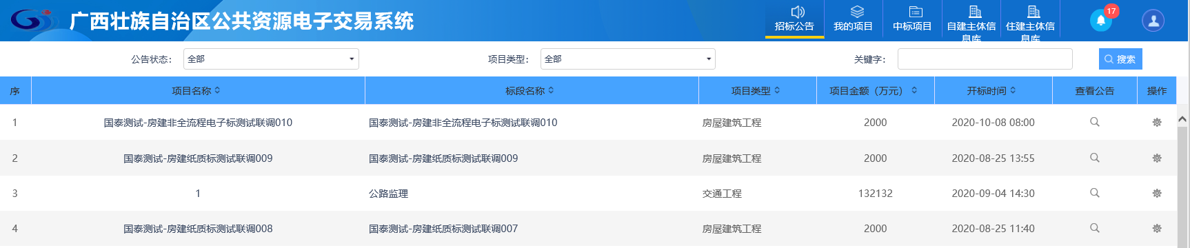 1、点击“招标公告”菜单,进入招标公告列表,如下图: