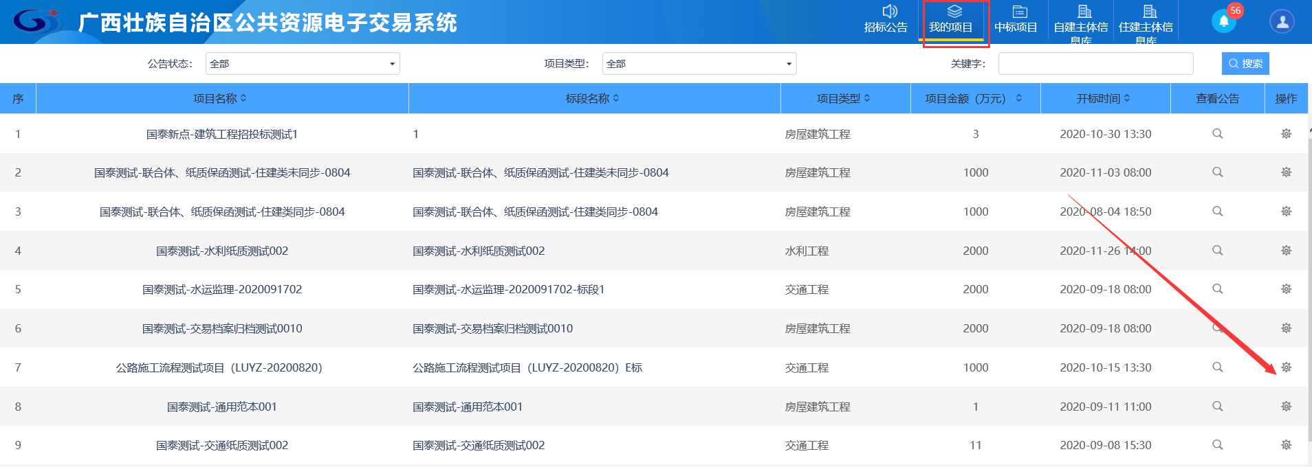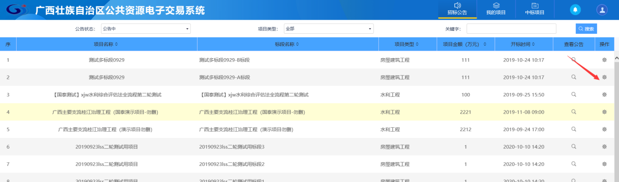 1、点击“我的项目”,找到需要领取答疑澄清文件的标段,点击“操作”按钮,如下图: