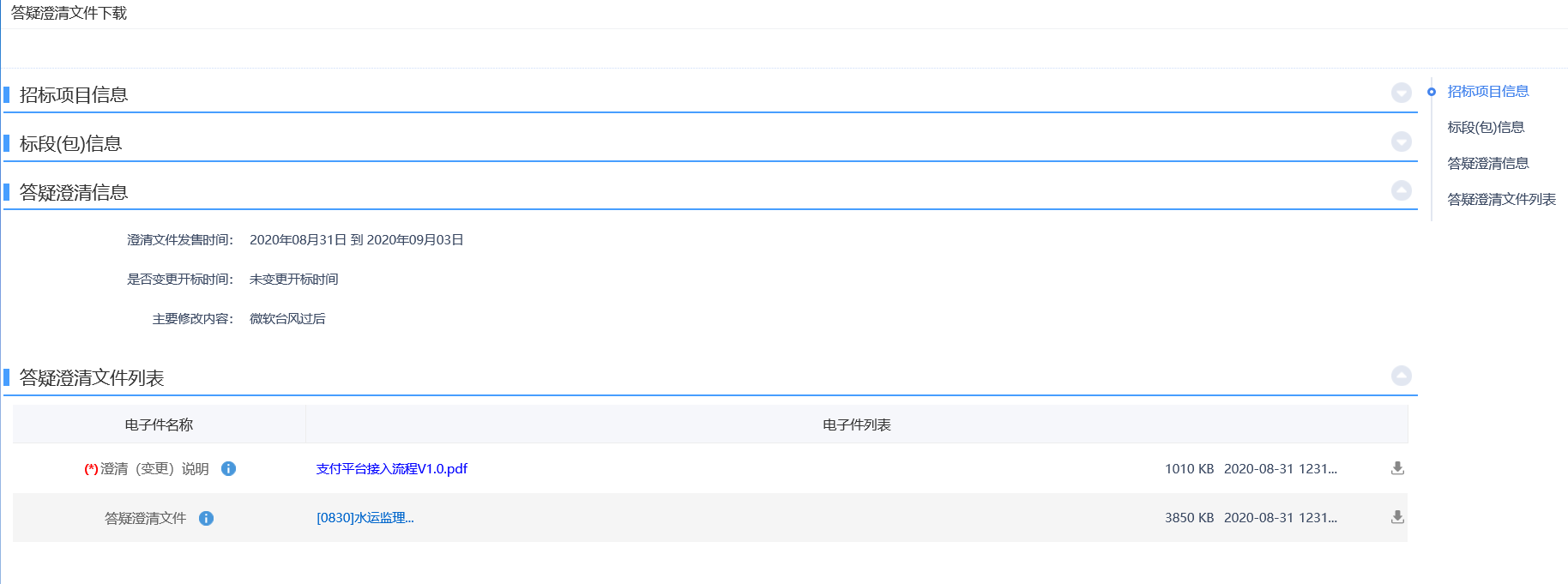 2、项目流程页面,点击“答疑澄清文件领取”菜单,进入“答疑澄清文件下载”页面,如下图: