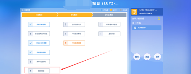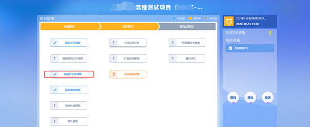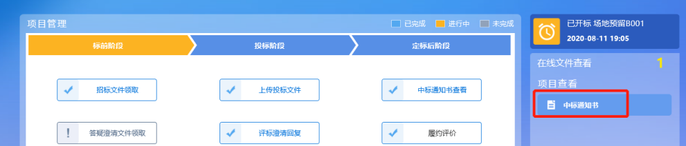 1、点击“中标项目”模块,选择标段,点击“项目流程”,进入项目流程页面,如下图: