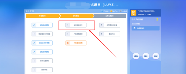 1、项目流程页面,点击“上传投标文件”菜单,进入“上传投标文件”页面,如下图: