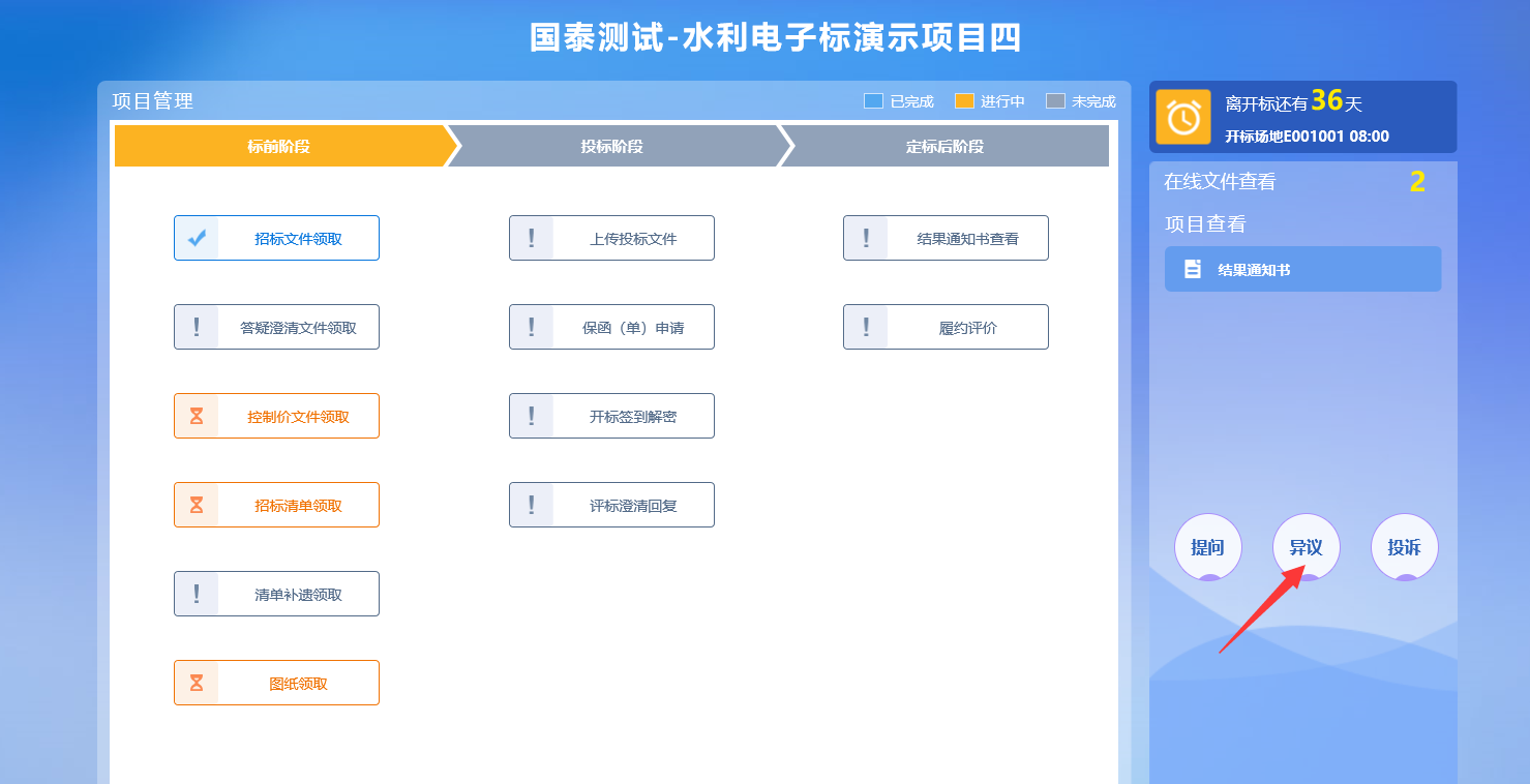 1、点击“我的项目”菜单,进入到我的项目页面。点击左下角的“异议”按键,如下图: