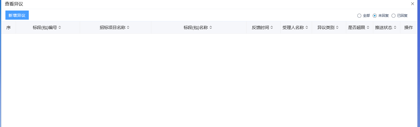 2、在弹出的页面显示异议列表,如要新增异议,点击左上角的新增异议,如下图: