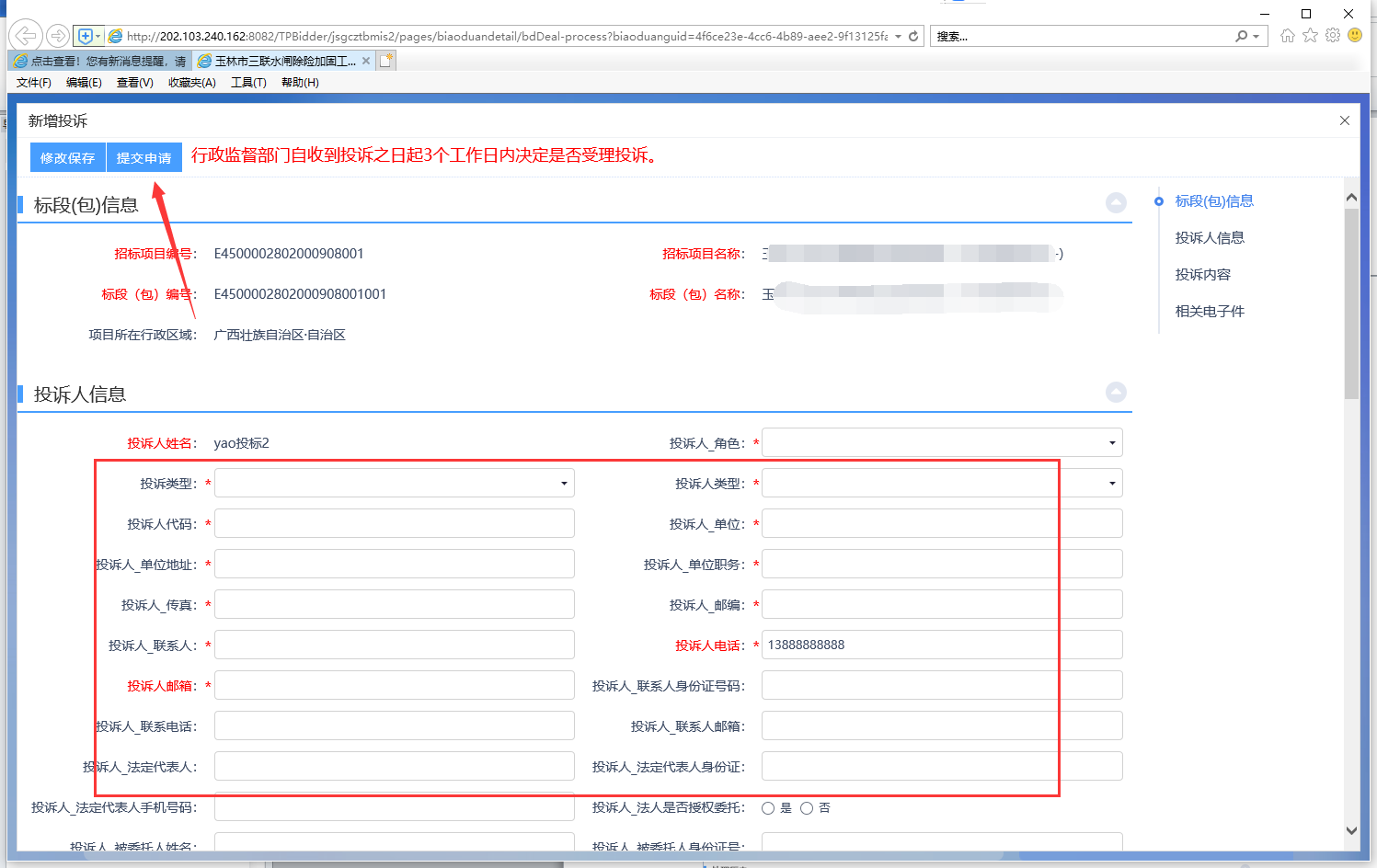 3、在新增投诉页面,填写投诉内容,完成后点击确定发送。投诉提交后,行业主管部门会进行受理,受理完成后在投标列表页查看受理结果。