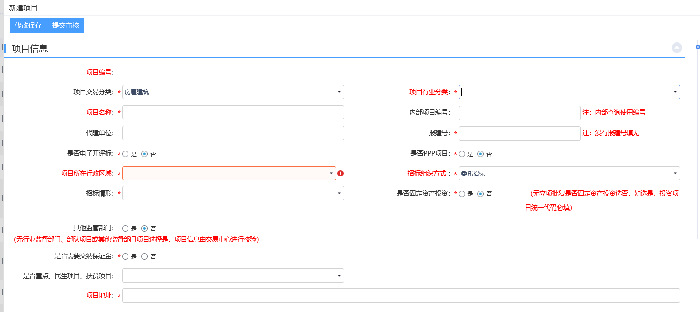 选择房屋建筑或市政交易分类,点击确定按钮进入“项目信息”填写页面: