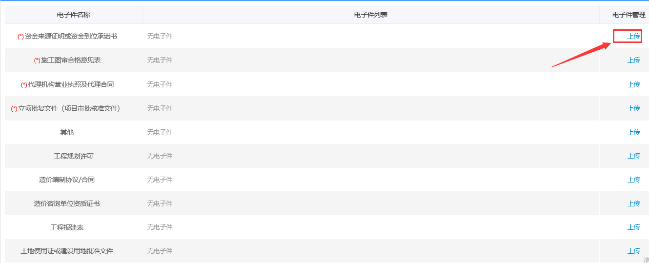 8、系统中扫描件均按照行业主管部门要求配置,如行业要求扫描件为必填,项目特殊无此类扫描件的,上传相关说明文件即可,扫描件如下图所示,点击上传按钮,上传附件。如下图: