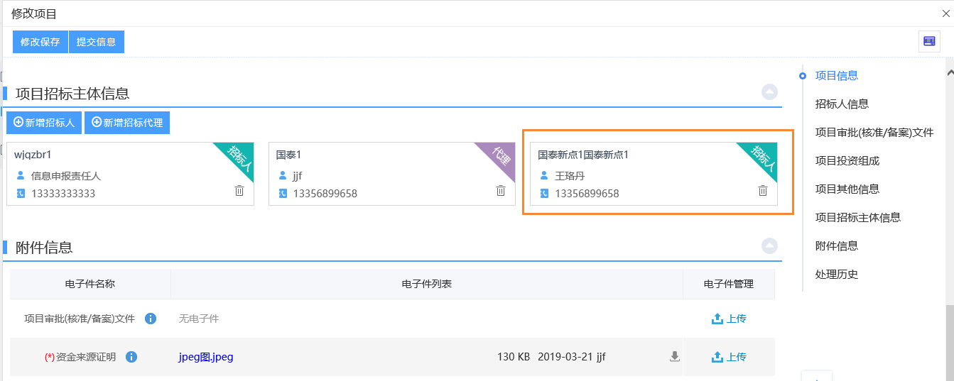 6、勾选招标人后,点击“确认选择”按钮,招标人添加到项目招标主体信息中,如下图: