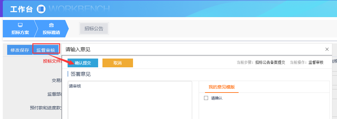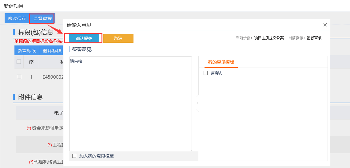7、填写完信息,点击“监督审核”按钮,弹出意见框,输入意见后,点击“确认提交”直接审核通过,如下图: