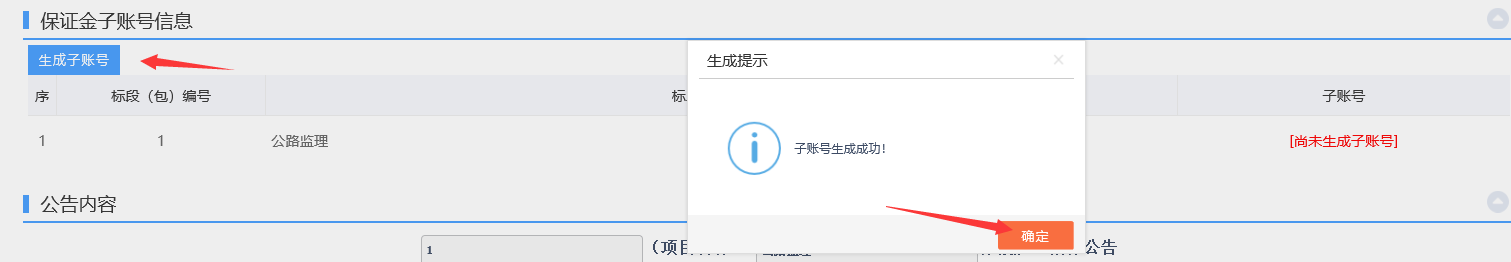 3、点击“生成子账号”按钮,页面提示子账号生成成功,点击确定,子账号下自动显示生成的模拟子账号的信息。