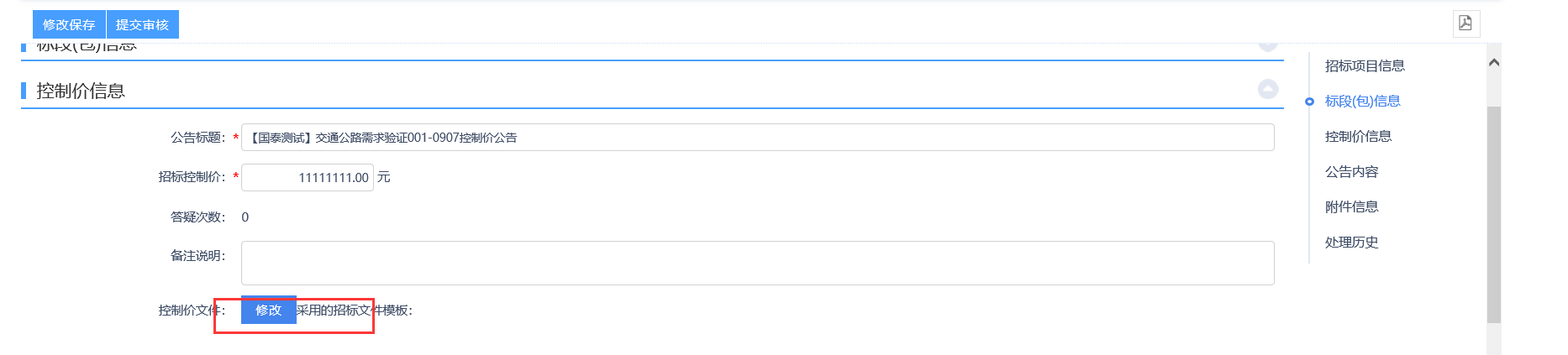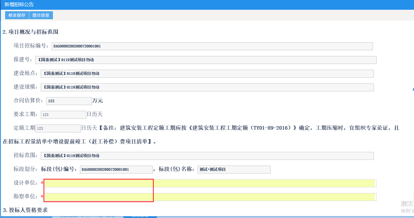 4、填写中标单位信息,填写完成后点击修改保存按钮: