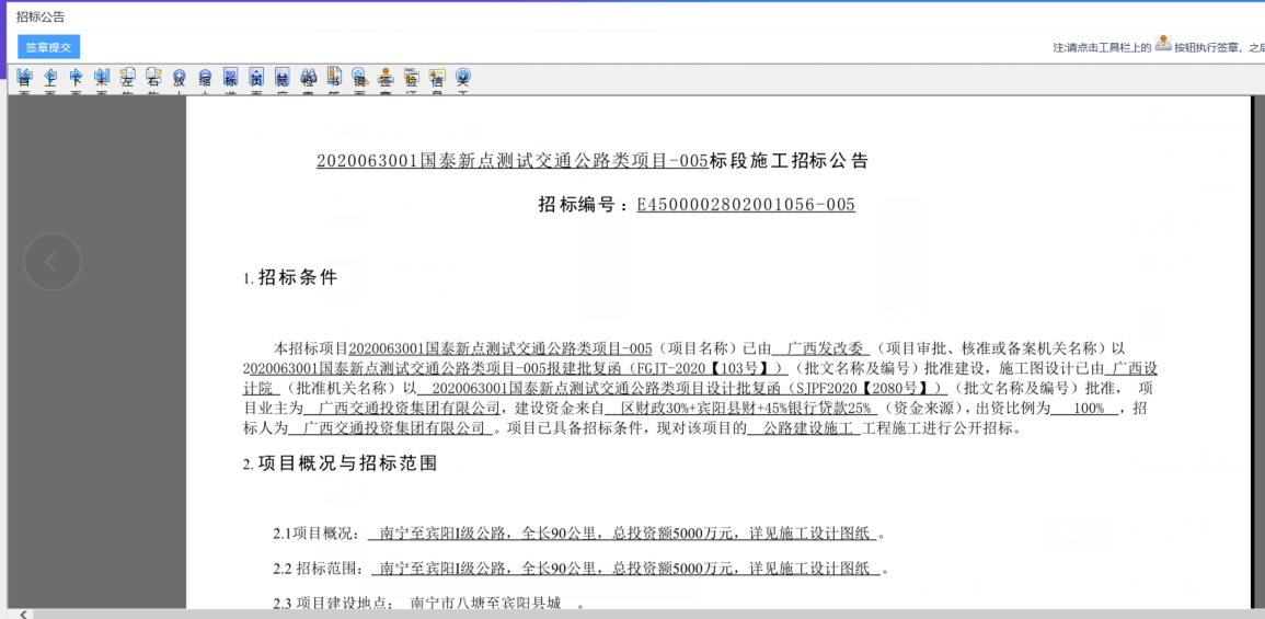 6、插入本单位CA主锁,点击“签章”按钮,签章并提交后,此时相关附件的招标公告变为“已签章”字样。