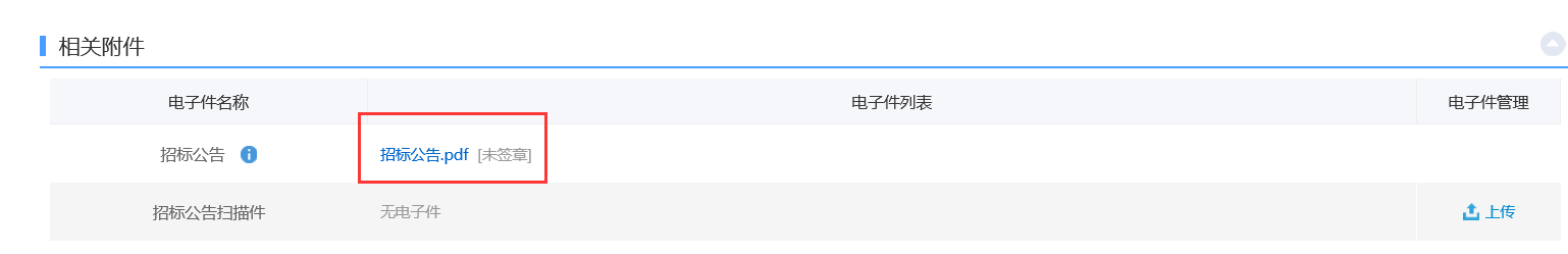 6、签章完毕后,关闭pdf页面,此时附件信息的中标结果公告变为“已签章”字样,如下图: