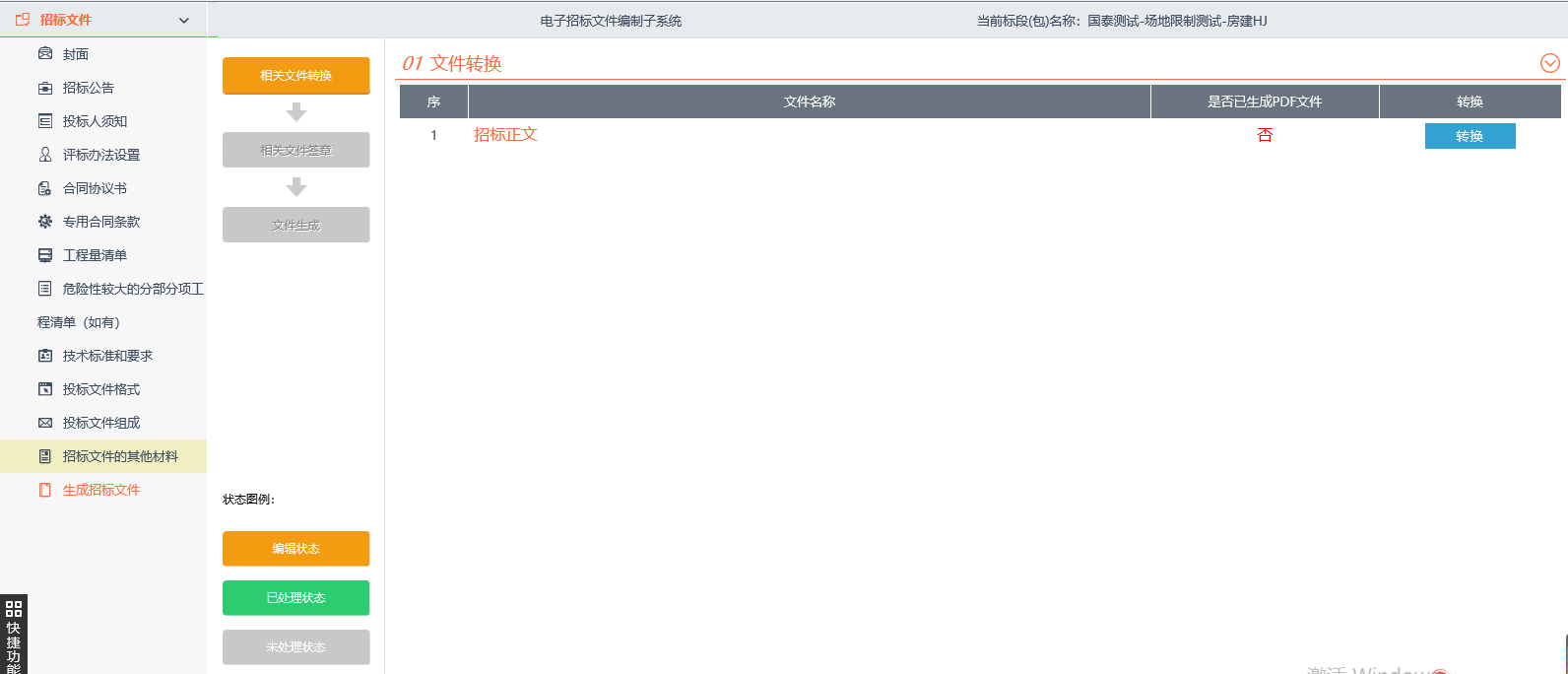 (11)点击“生成招标文件”,点击【转换】按钮,把招标正文转换为PDF格式。跳出弹窗提示“正文转换成功”,点击‘确定’完成转换。