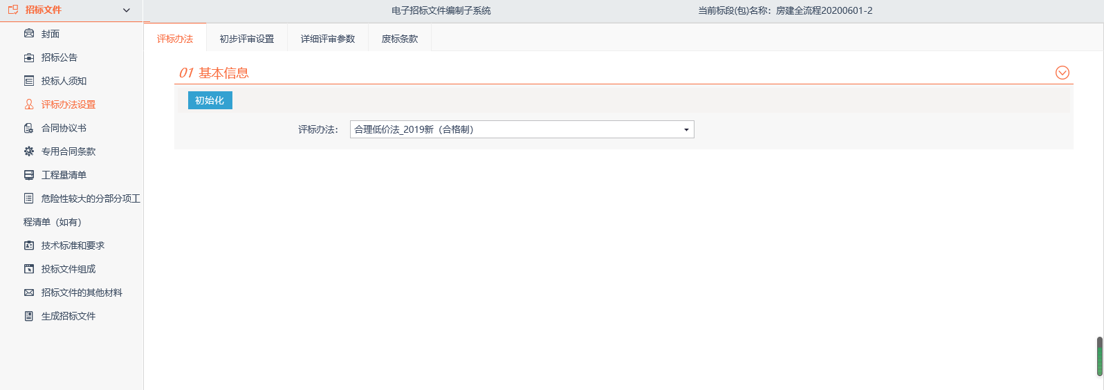 (4)点击“评标办法设置”,根据项目情况设置评标办法及评审参数。