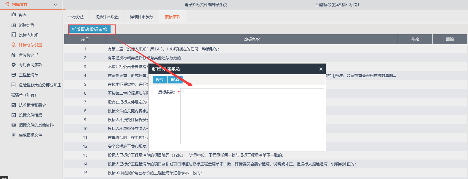 点击【否决投标】,范本中已经有固定的否决投标条款,不允许删除,招标代理可点击“新增否决投标条款”进行新增: