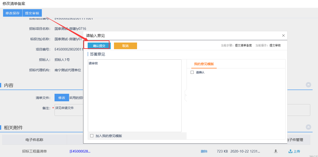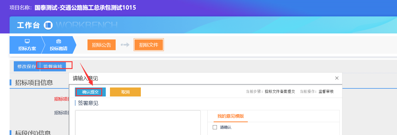 6、点击“提交审核”按钮,弹出意见框中输入意见,提交后招标文件直接通过,无需审核。