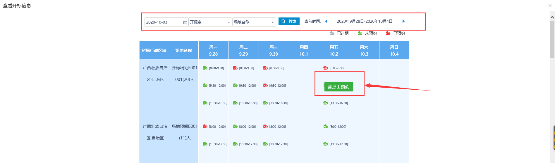 2、进入开评标场地预约页面,选择开标时间、开标场地。如下图: