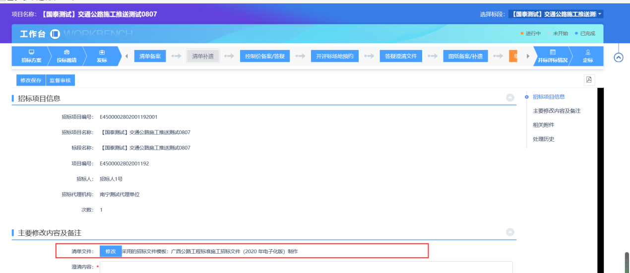 2、清单补遗页面,点击【修改】制作清单补遗文件,如下图:
