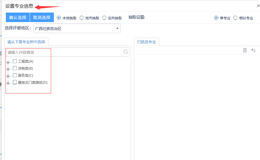 3、在专业选择页面,选择需要抽取的专业、地区,填写完成后确认选择,如图所示:
