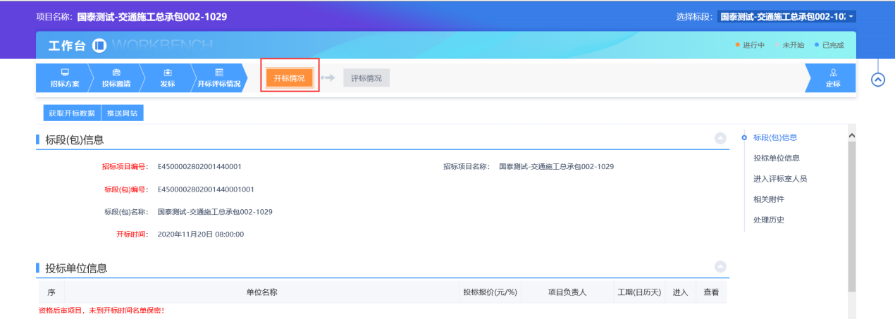 1、点击“开标评标—开标情况”菜单,须过开标时间后,开标情况页面才能获取投标单位数据。如下图: