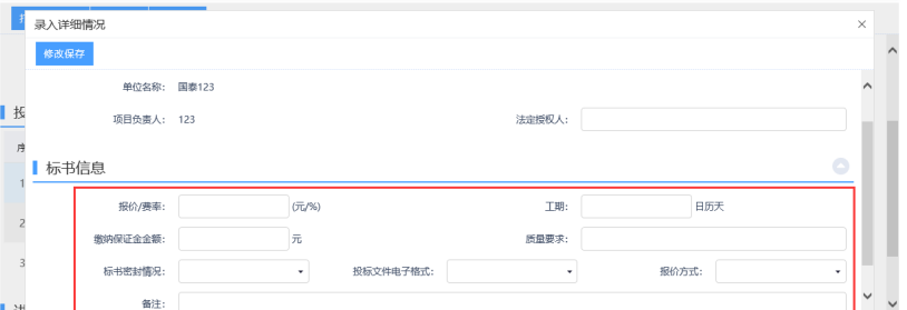 2、开标情况页面,点击“进入”按钮,填写页面字段信息,如下图: