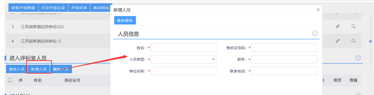 4、开标情况页面,进入评标室人员,点击“新增人员”按钮,进入“新增人员”页面,填写页面字段信息并保存。如下图: