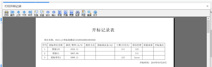 8、查看开标情况页面,点击“打印开标记录”按钮。如下图: