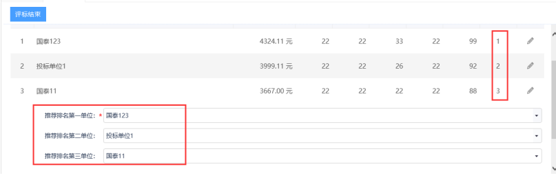 5、评标结果页面,推荐排名与评标排名一致。如下图: