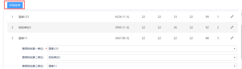 6、评标情况录入完成后,点击“评标结束”按钮。如下图:
