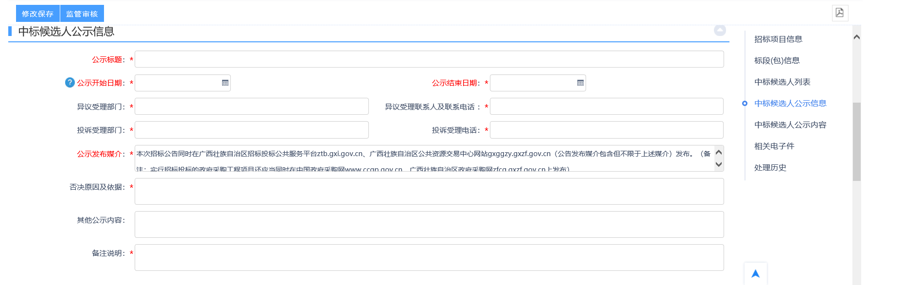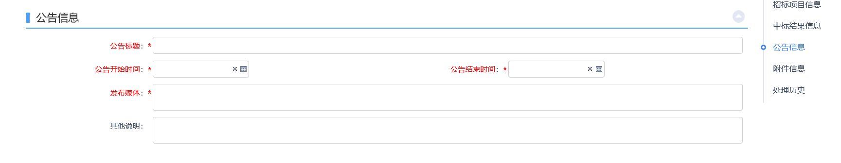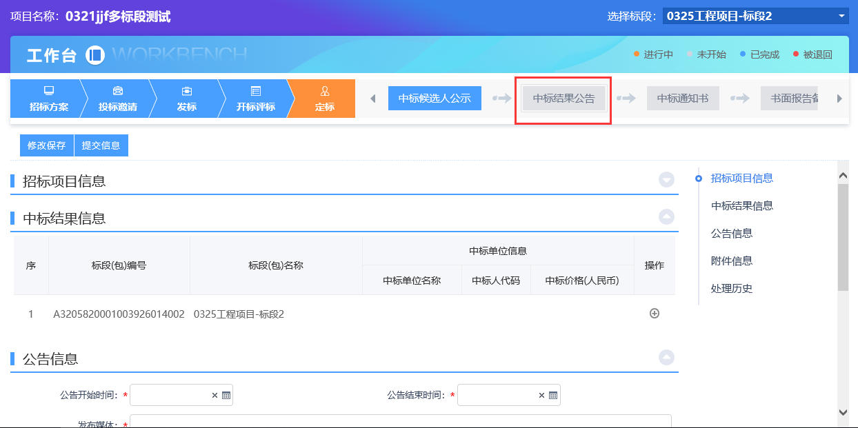 2、中标结果公告页面,填写中标结果信息和公告信息,如下图:
