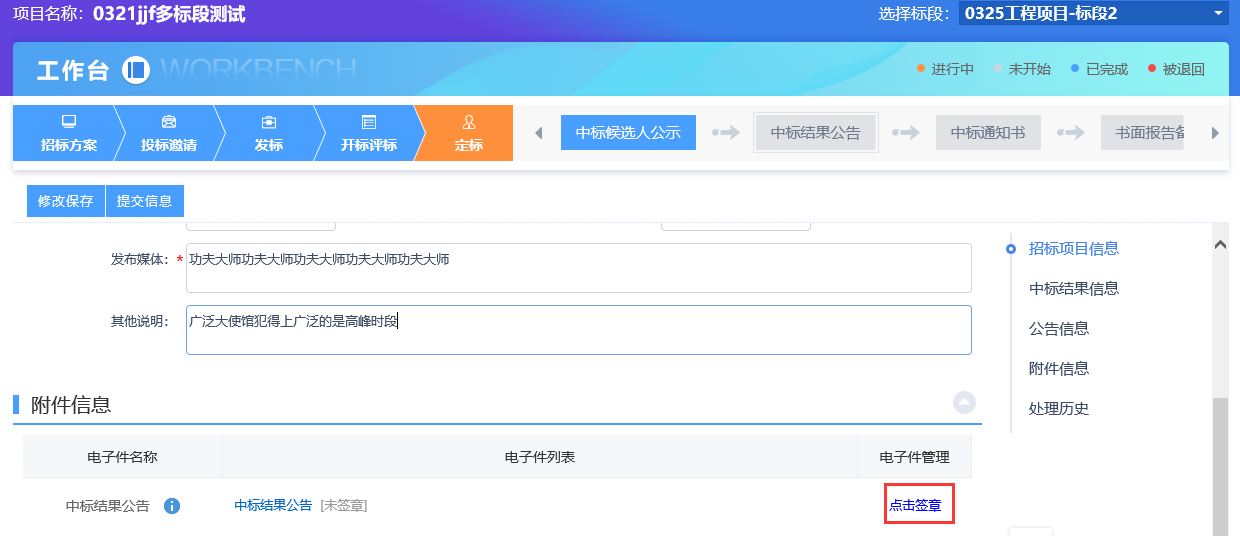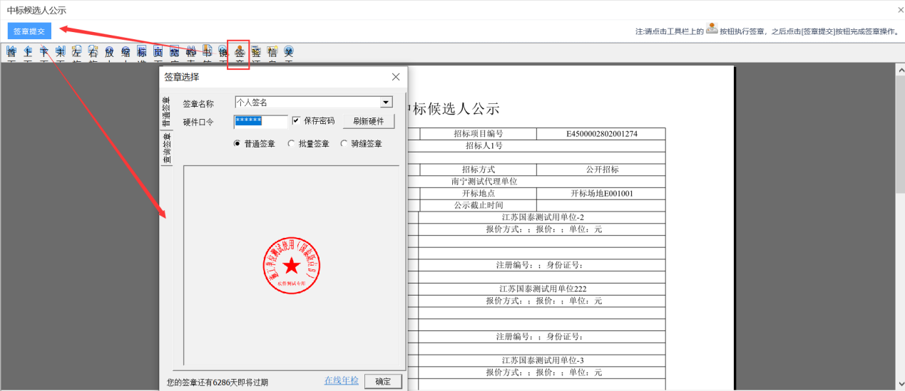 在签章页面核查中标结果公告内容是否有误,无问题后进行签章: