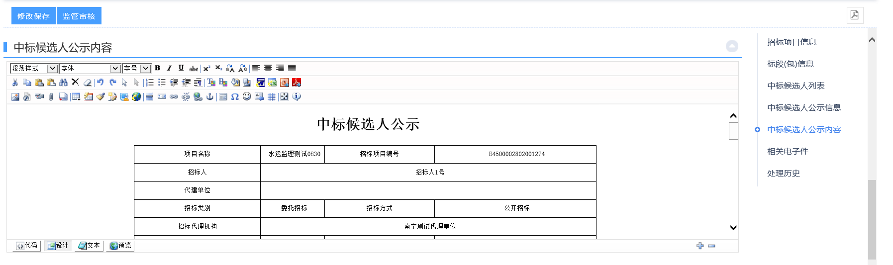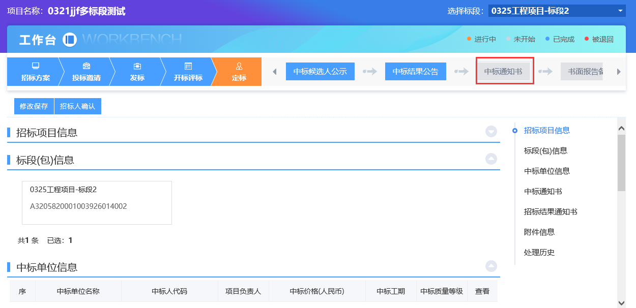 5、选择中标单位和中标项目负责人后,点击“修改保存”按钮,中标结果信息中显示刚才选取的中标单位,如下图: