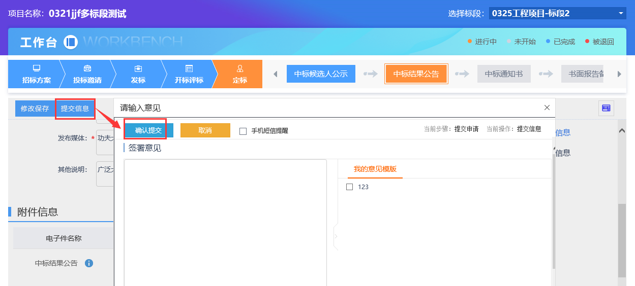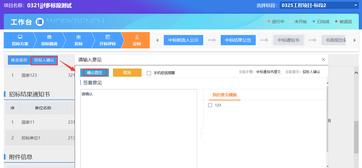 6、所有通知书都生成且完成签章后,点击“提交审核”按钮,弹出意见框,输入意见后,点击“确认提交”按钮,提交确认。提交后中标通知书与中标结果公告一并提交行业主管部门审核,审核通过后发布到外网,如下图: