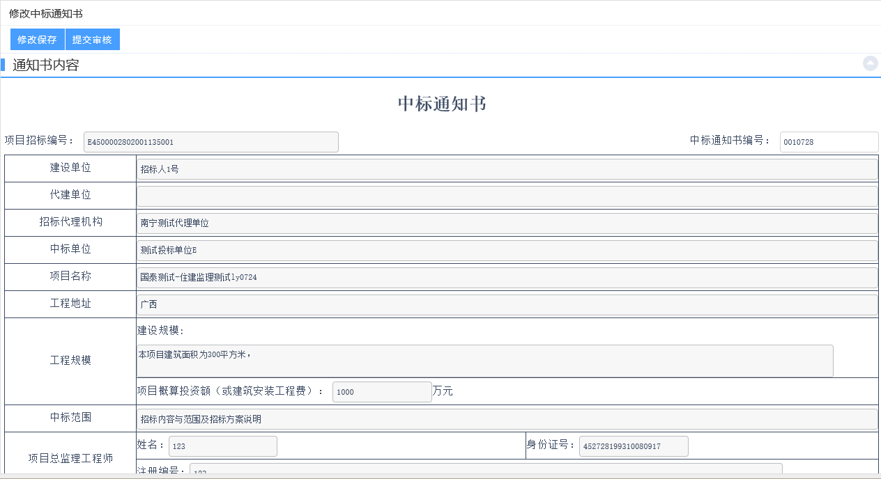 2、按照模板填写中标通知书内容,如下图,灰色部分获取项目登记及其他环节数据,白色文本框可自由进行编写: