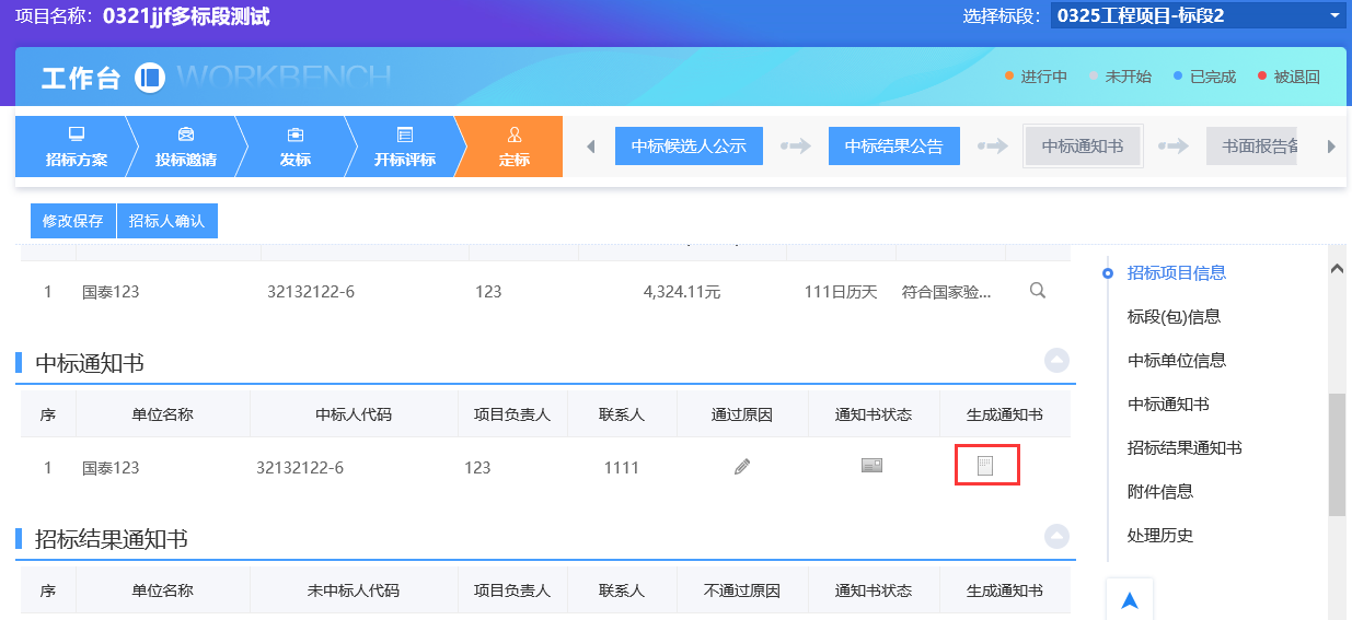 5、签章完毕后,返回“中标通知书”页面,“生成通知书”按钮变为红色,如下图: