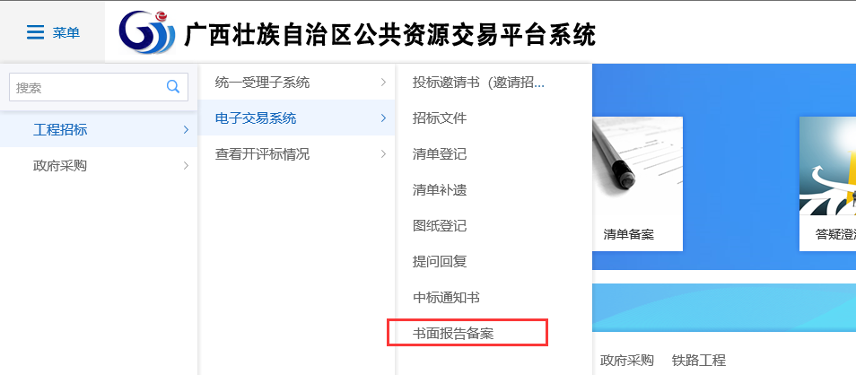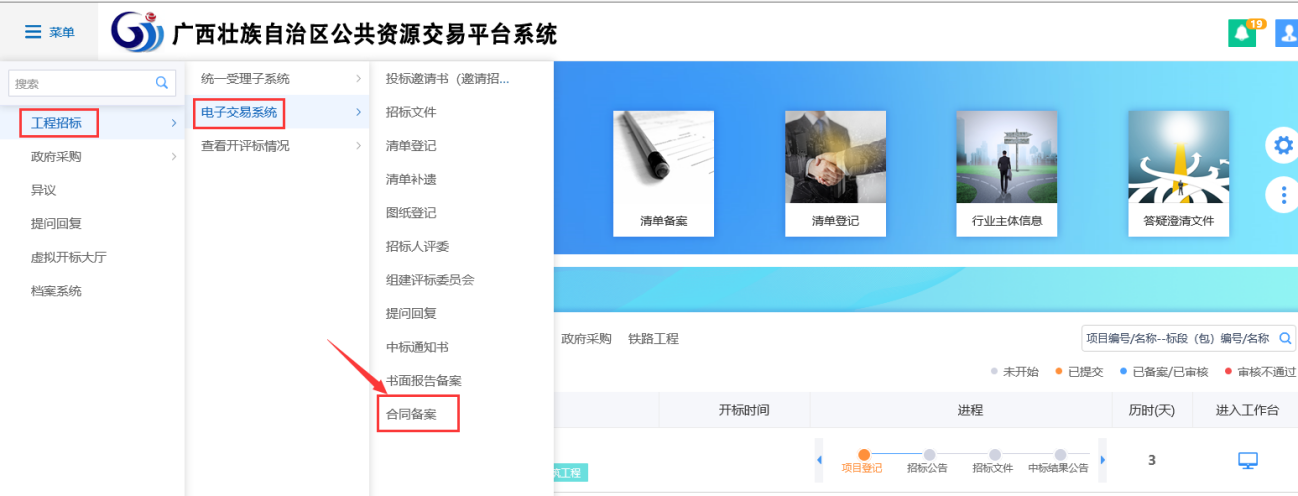 1、点击工程建设-电子交易系统-合同备案菜单,如下图: