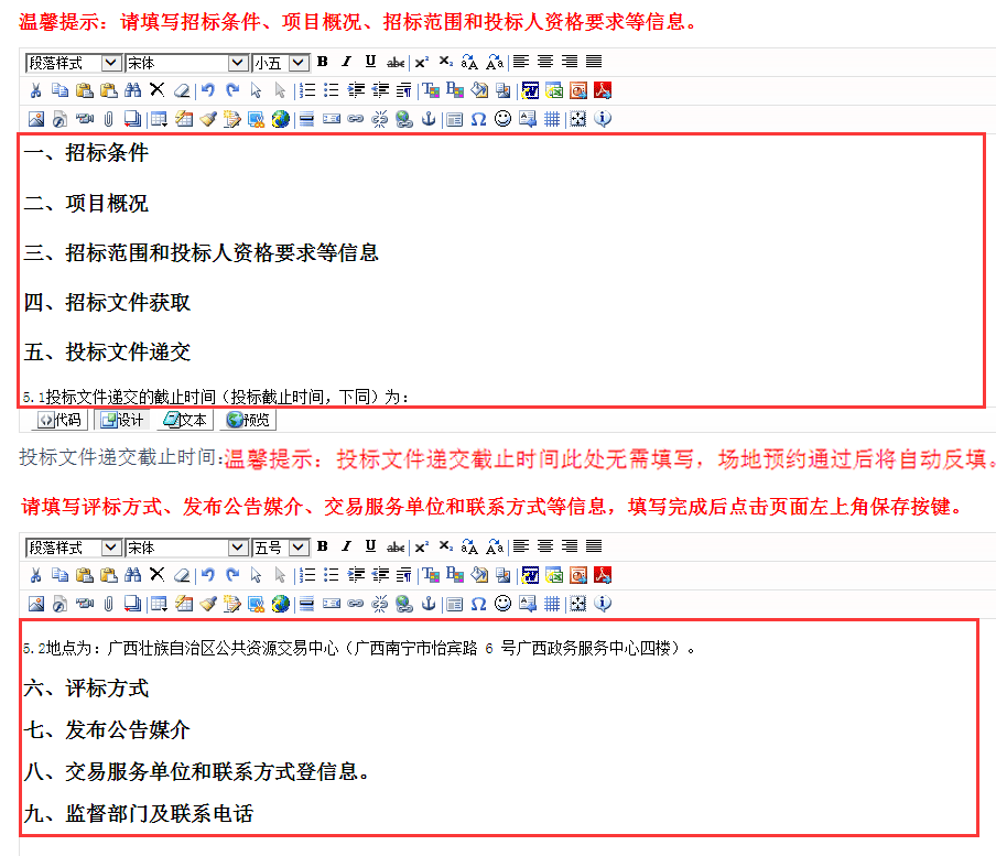 2.“投标文件递交截止时间”之后的文本内容如评标方式、发布公告媒介、交易服务单位和联系方式、监督部门及联系电话等信息放在第二个方框内)如下图所示: