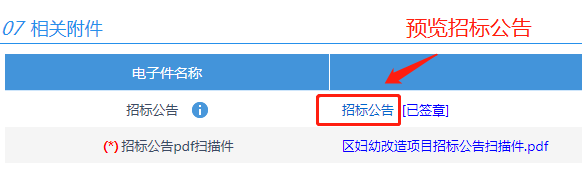 3.编辑完招标公告后,点击下方招标公告可以预览公告内容。请认真核查公告内容(注意:投标文件截止时间显示位置是否正确),场地预约一但通过,无法修改。预览时投标文件递交截止时间暂时显示“/”,待场地预约流程完成后会显示正确时间。