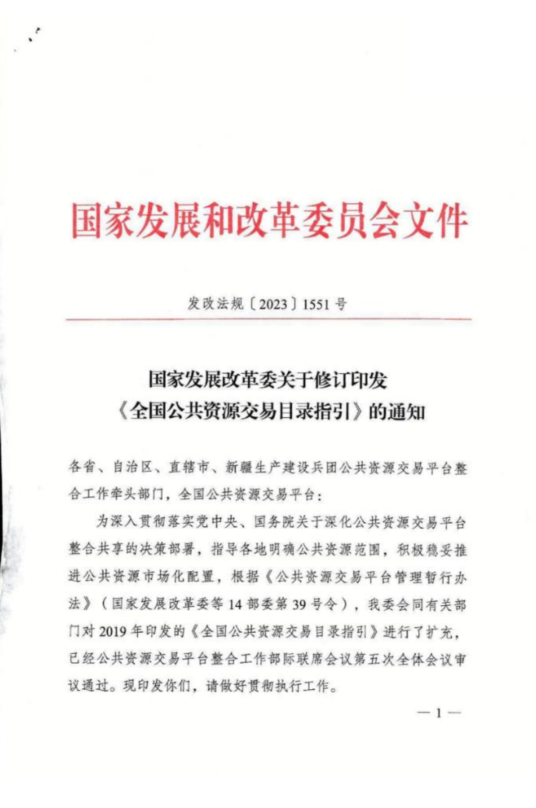 国家发展和改革委员会关于修订印发《全国公共资源交易目录指引》的通知
