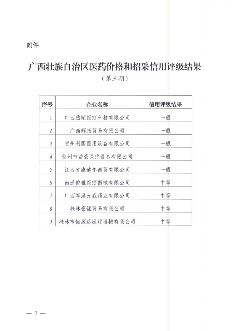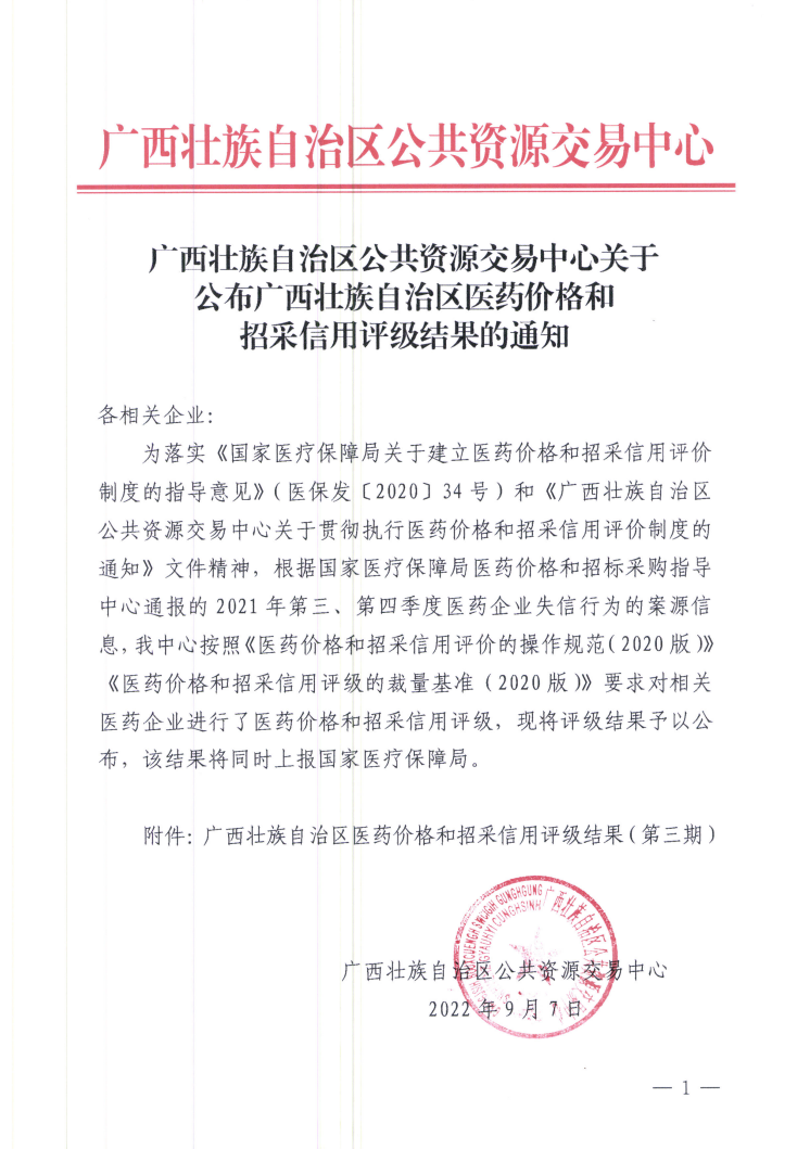 关于公布广西壮族自治区医药价格和招采信用评级结果的通知(第三期)