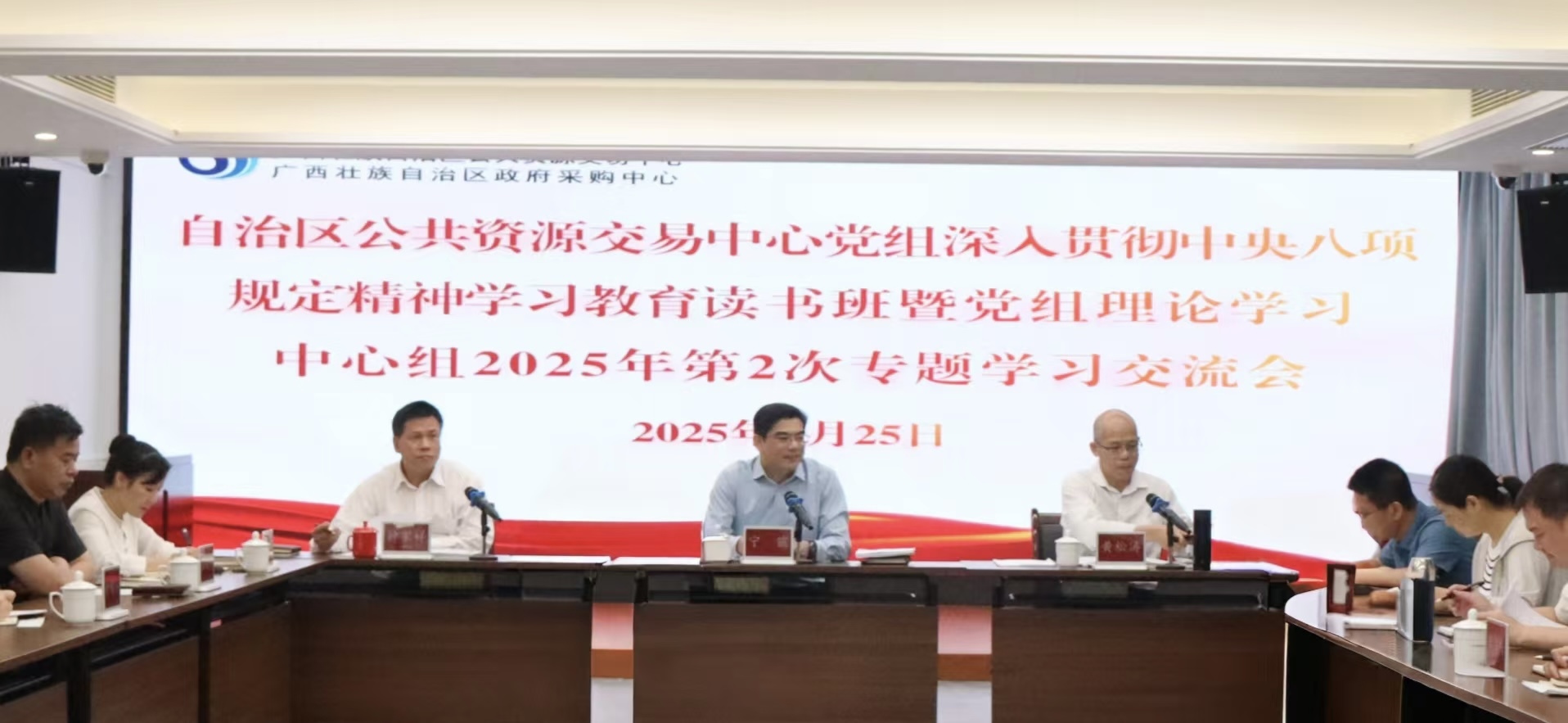 为持续深化党的作风建设,推动深入贯彻中央八项规定精神学习教育,2025年4月24日至25日,广西壮族自治区公共资源交易中心(以下简称交易中心)举办深入贯彻中央八项规定精神学习教育读书班暨党组理论学习中心组2025年第2次专题学习交流会。交易中心党组书记、主任宁镔主持,党组成员、副主任黄松涛、钟家祥及副处级以上干部参加。
