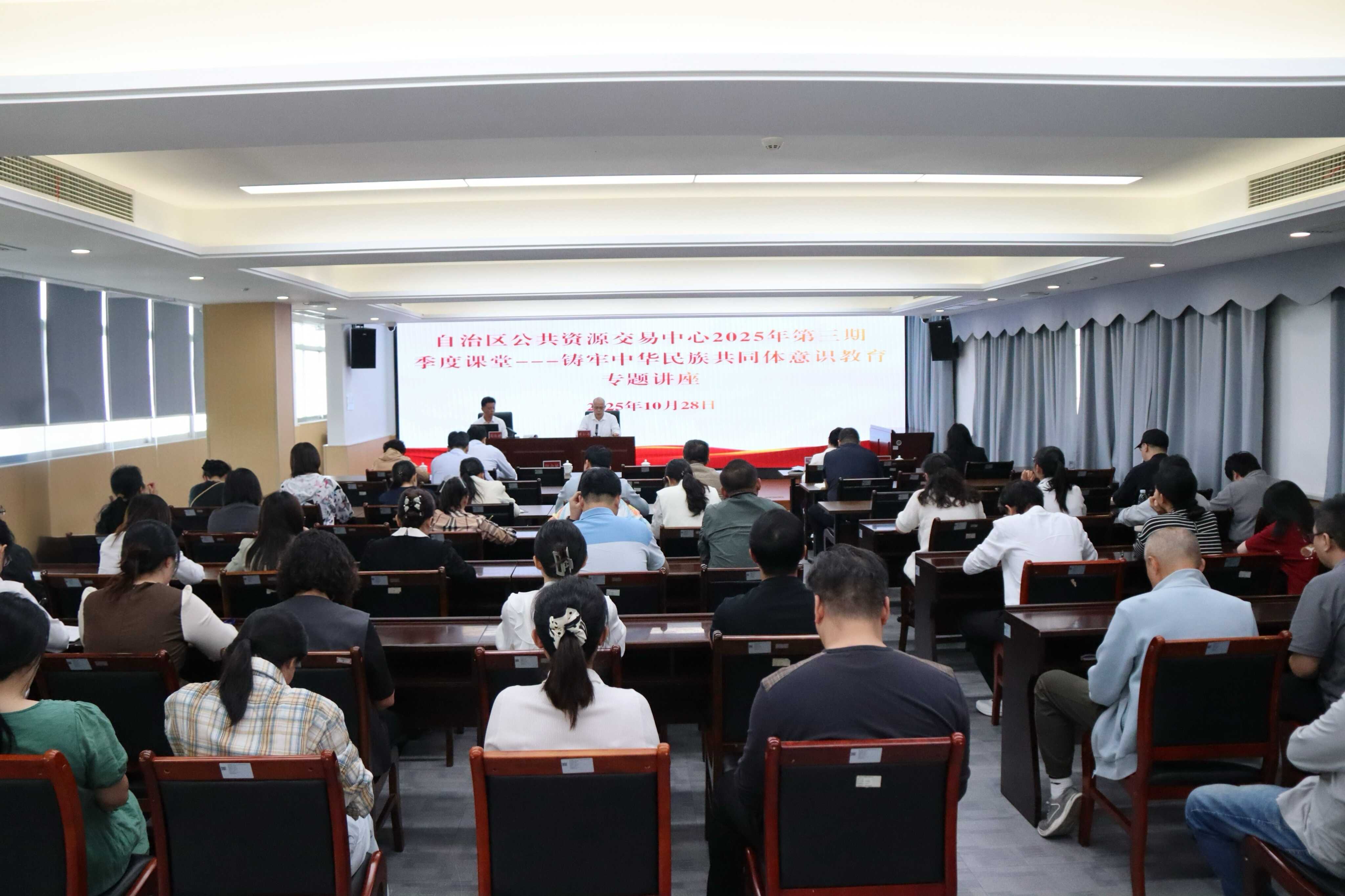 为深入贯彻落实习近平总书记关于加强和改进民族工作的重要思想,进一步推动铸牢中华民族共同体意识学习教育走深走实,2025年10月28日,自治区公共资源交易中心(以下简称交易中心)举办“铸牢中华民族共同体意识教育”专题讲座。自治区民宗委二级巡视员吴汉时受邀授课,交易中心党组成员、副主任黄松涛主持,全体工作人员参加。