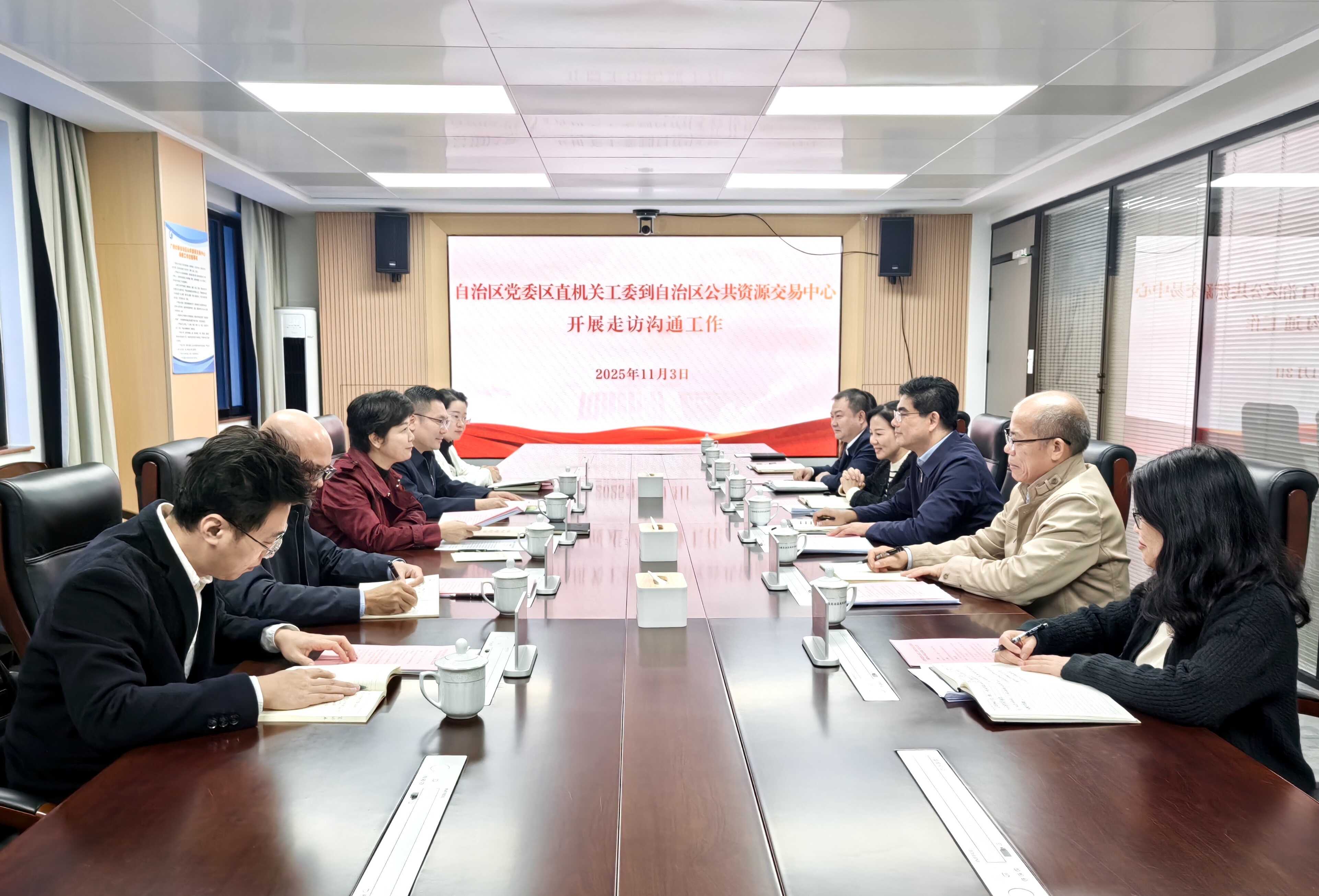 2025年11月3日,自治区党委区直机关工委分管日常工作的副书记罗荣莉率队,到自治区公共资源交易中心(以下简称交易中心)开展走访沟通工作,双方就如何推动机关党建工作高质量发展进行座谈交流。