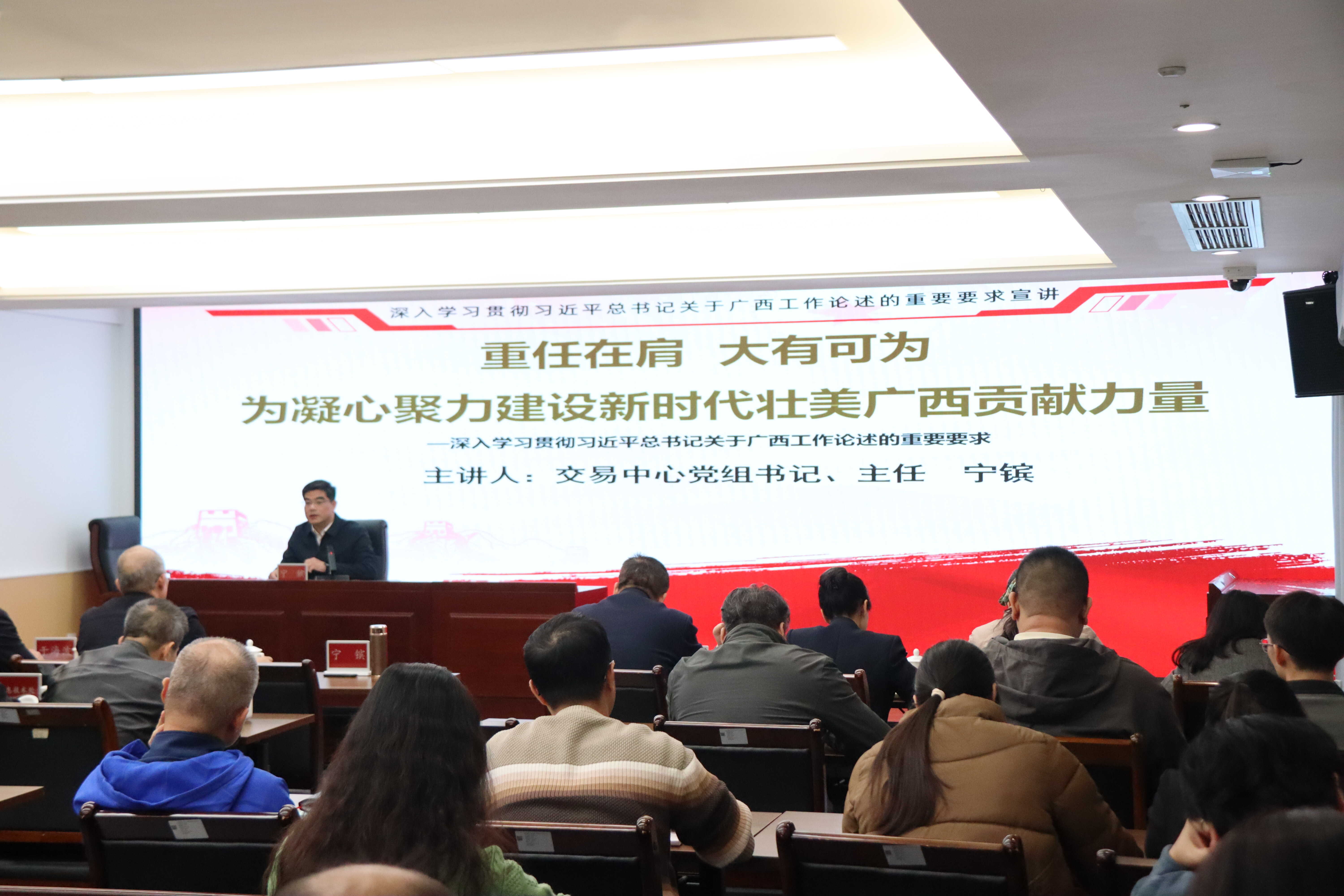 2025年11月19日,自治区公共资源交易中心(以下简称交易中心)举办青年群体宣讲报告会,中心党组书记、主任宁镔以《重任在肩 大有可为 为凝心聚力建设新时代壮美广西贡献力量》为题,为全中心青年干部职工作学习贯彻习近平总书记关于广西工作论述的重要要求专题宣讲。